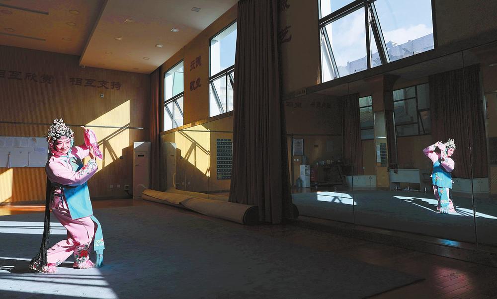 云南省滇剧院里,独自在练功房里对镜练习的演员。