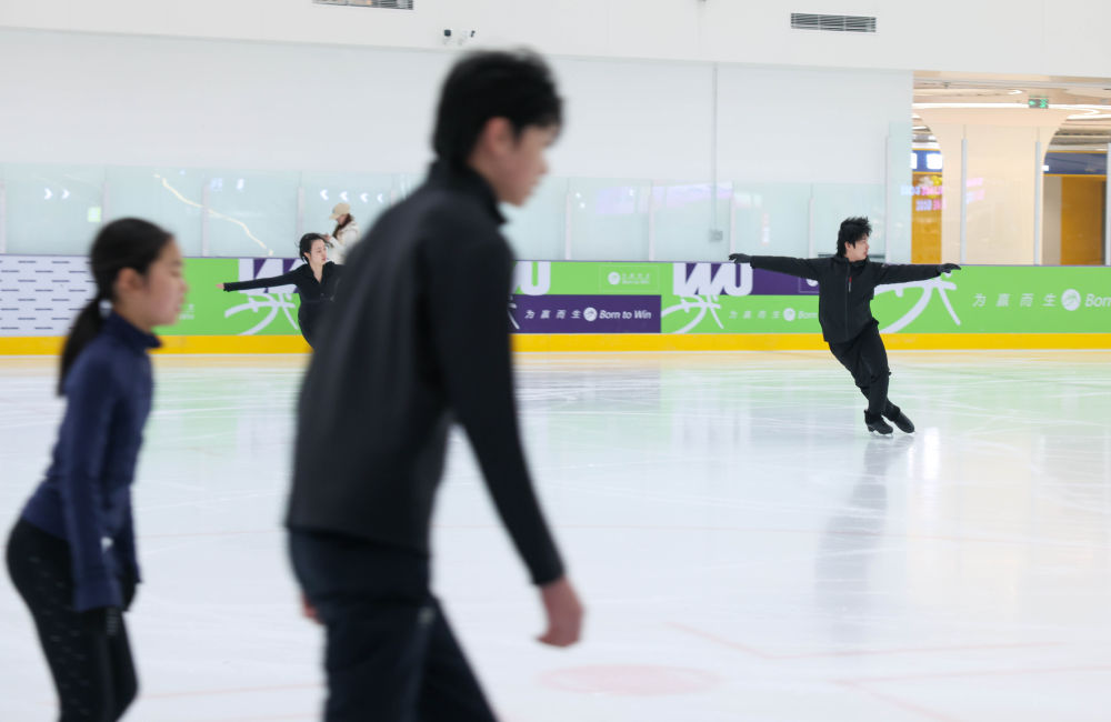 在滑雪场楼上的大靖冰上基地,1800平方米的国际标准冰场同样热闹非凡。从初学者到专业选手,冰场上滑行、旋转、追逐的身影,勾勒出春日里活力四射的运动场景。