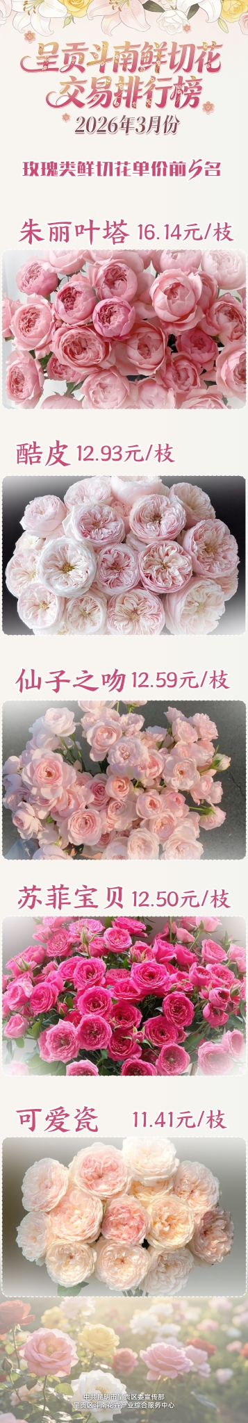 玫瑰销量:橙色芭比居首 粉色雪山系表现突出玫瑰仍是春季鲜切花市场的核心花材。据昆明国际花卉拍卖交易中心与斗南花市联合统计,3月玫瑰销量前五名分别为:橙色芭比(1061.63万枝)、粉红雪山(861.27万枝)、折射(776.43万枝)、洛神(692.05万枝)、蜜桃雪山(578.27万枝)。橙色芭比连续位居榜首,粉色雪山系列表现亮眼。玫瑰单价:高端品种理性回落 日常消费占比上升受春季供货充足、消费从节日刚需转向日常礼赠与居家装饰等因素影响,高端玫瑰价格较2月有所回落,整体价格更趋亲民。3月玫瑰单价前五名分别为:朱丽叶塔(16.14元/枝)、酷皮(12.93元/枝)、仙子之吻(12.59元/枝)、苏菲宝贝(12.50元/枝)、可爱瓷(11.41元/枝)。高端品种仍保持稳定溢价。