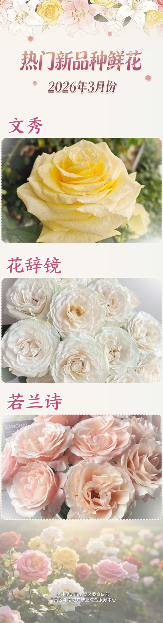 百合销量:经典品种稳居主流 多元需求支撑增长百合在居家装饰、商务用花、节日礼赠等多重需求带动下,销量稳中有升。3月百合销量前五名分别为:西伯利亚(51.24万枝)、索尔邦(42.26万枝)、罗宾娜(21.25万枝)、黄天霸(10.94万枝)、艾莎(10.21万枝)。传统经典品种依然占据市场主流。百合单价:重瓣品种再创新高 高端溢价能力凸显消费者对高品质、高颜值重瓣百合的付费意愿持续提升。3月百合单价前五名中,重瓣品种冰美人(24.12元/枝)和女神(22.14元/枝)稳居前两位,单价再创新高。西伯利亚(13.67元/枝)、黄天霸(12.54元/枝)、罗宾娜(12.33元/枝)分列其后。色系偏好:渠道差异明显 白色粉色各领风骚拍卖中心、线下花市、线上平台依托精准定位实现差异化运营。昆明国际花卉拍卖交易中心以白色系最受欢迎,契合大宗批发的简约雅致需求;斗南花市以粉色系占据主导,适配线下春日浪漫、婚庆礼赠场景;花易宝平台同样以白色系销量领先,受线上简约居家、商务礼品消费群体青睐。三款新品种亮相 “文秀”致敬时代楷模3月,云南省农业科学院花卉研究所推出三款新品种鲜切花。“文秀”为单头无香品种,鹅黄色,瓶插期长、抗病性强,命名致敬“时代楷模”黄文秀;“花辞镜”为多头淡香品种,花瓣柔软少折痕,颜色由杏仁白渐变为清冷白;“若兰诗”为单头淡香品种,花大,橘粉色调,遇水即开,冷天仍可正常瓶插开放。