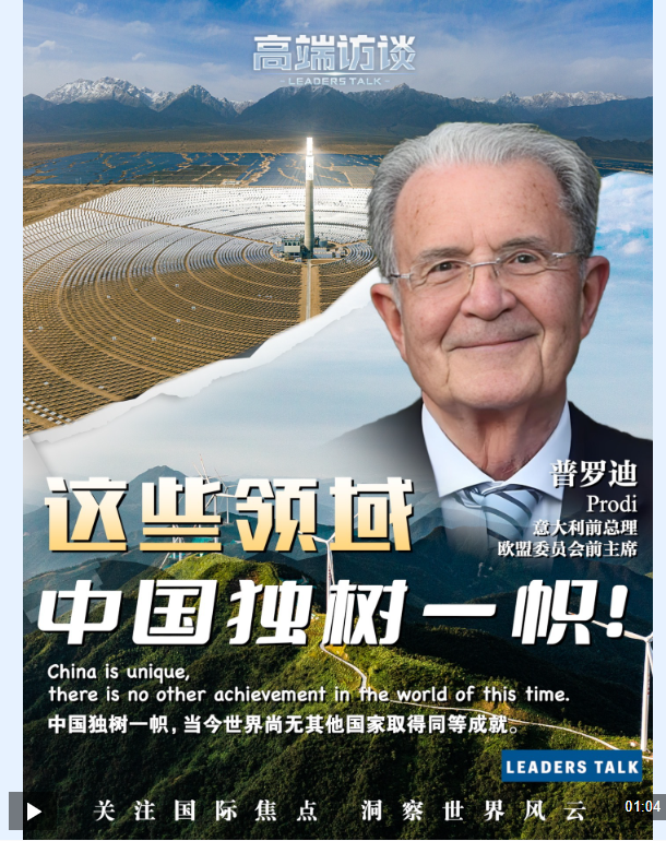 意大利前总理、欧盟委员会前主席 普罗迪:从普遍认知来看,最重要的成就是大规模新兴产业的发展。高新技术领域的大规模生产,包括电动汽车、电池、太阳能和风能产业,这是全新且规模庞大的生产体系。在这些领域,中国独树一帜,当今世界尚无其他国家取得同等成就。同时,中国也保持了中间品生产等传统优势。从经济学视角看,这正是中国与其他经济体的显著差异。