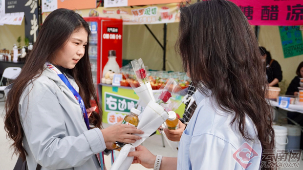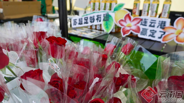 连云港市体育中心内人声鼎沸、氛围热烈。在赛事专属展示区,娇艳欲滴的玫瑰、清新雅致的洋桔梗等云南鲜切花整齐摆放,馥郁花香弥漫全场;来自云南康旅集团三七科技有限公司的多种云南高原好物同步陈列,吸引众多球迷驻足品尝、领取体验。“第一次在足球赛场收到云南鲜花,太惊喜了!”“云南咖啡口感醇厚,和球赛很配!”球迷们手持鲜花、品鉴咖啡,纷纷为这场跨界联动点赞,在呐喊助威之余,沉浸式感受“有一种生活叫云南”的独特魅力。