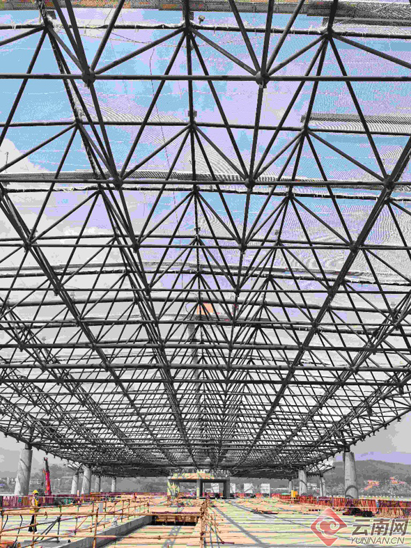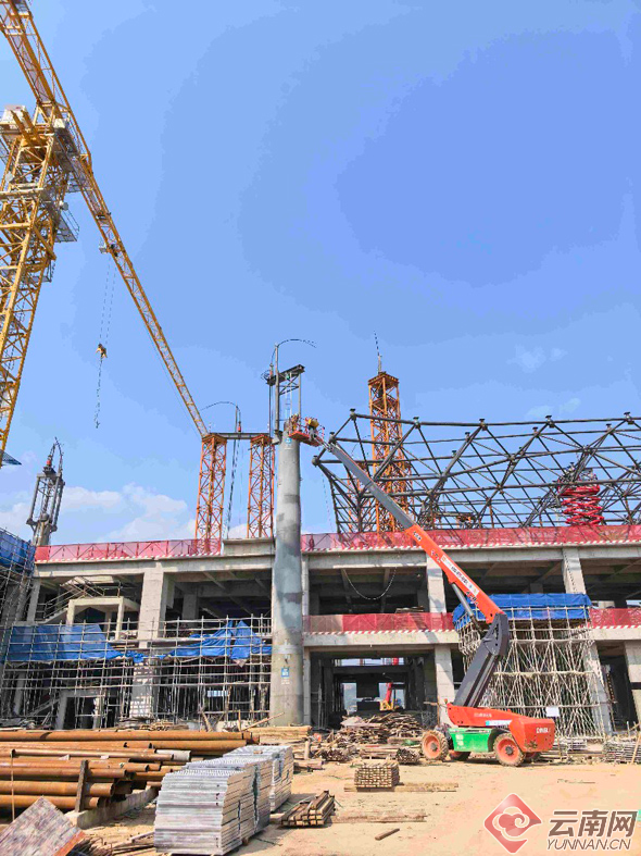 目前,项目各子工程均按既定规划高效推进。航站楼主体工程已全面完工,北指廊金属屋面安全网搭设完毕,钢结构、金属屋面檩条等材料正陆续进场作业;停车楼较计划提前60天实现封顶,正全力推进内外装饰施工;站前高架桥下部墩柱完成95%,3联现浇梁已完成浇筑;配套管网工程同步有序开展。