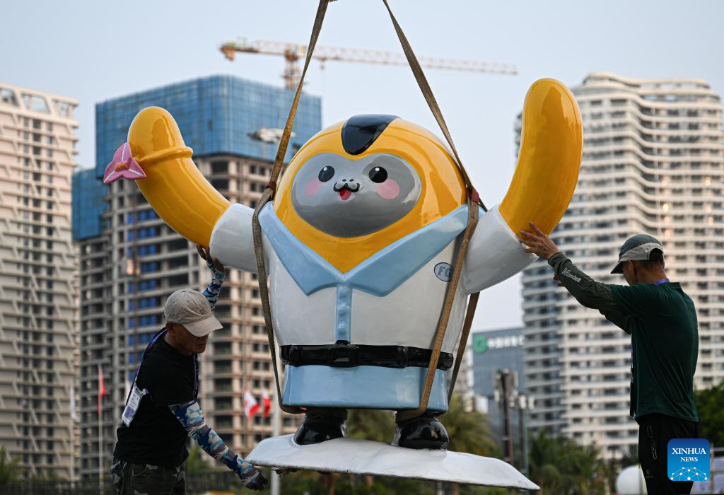 Workers hoist a mascot of the sixth China International Consumer Products Expo (CICPE) at the Hainan International Convention and Exhibition Center, the main venue for the upcoming sixth CICPE, in Haikou, south China's Hainan Province, April 10, 2026. Scheduled to take place in south China's Hainan Province from April 13 to 18, this expo will see the participation of more than 3,400 brands from over 60 countries and regions. (Xinhua/Pu Xiaoxu)