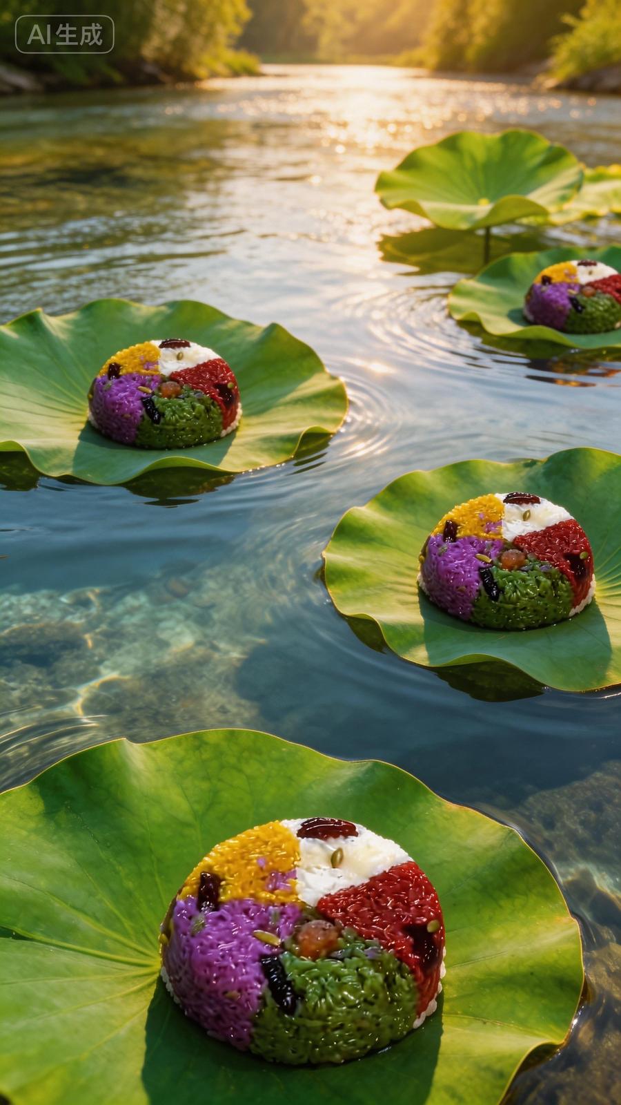 碧绿荷叶托着一个个彩色八宝饭