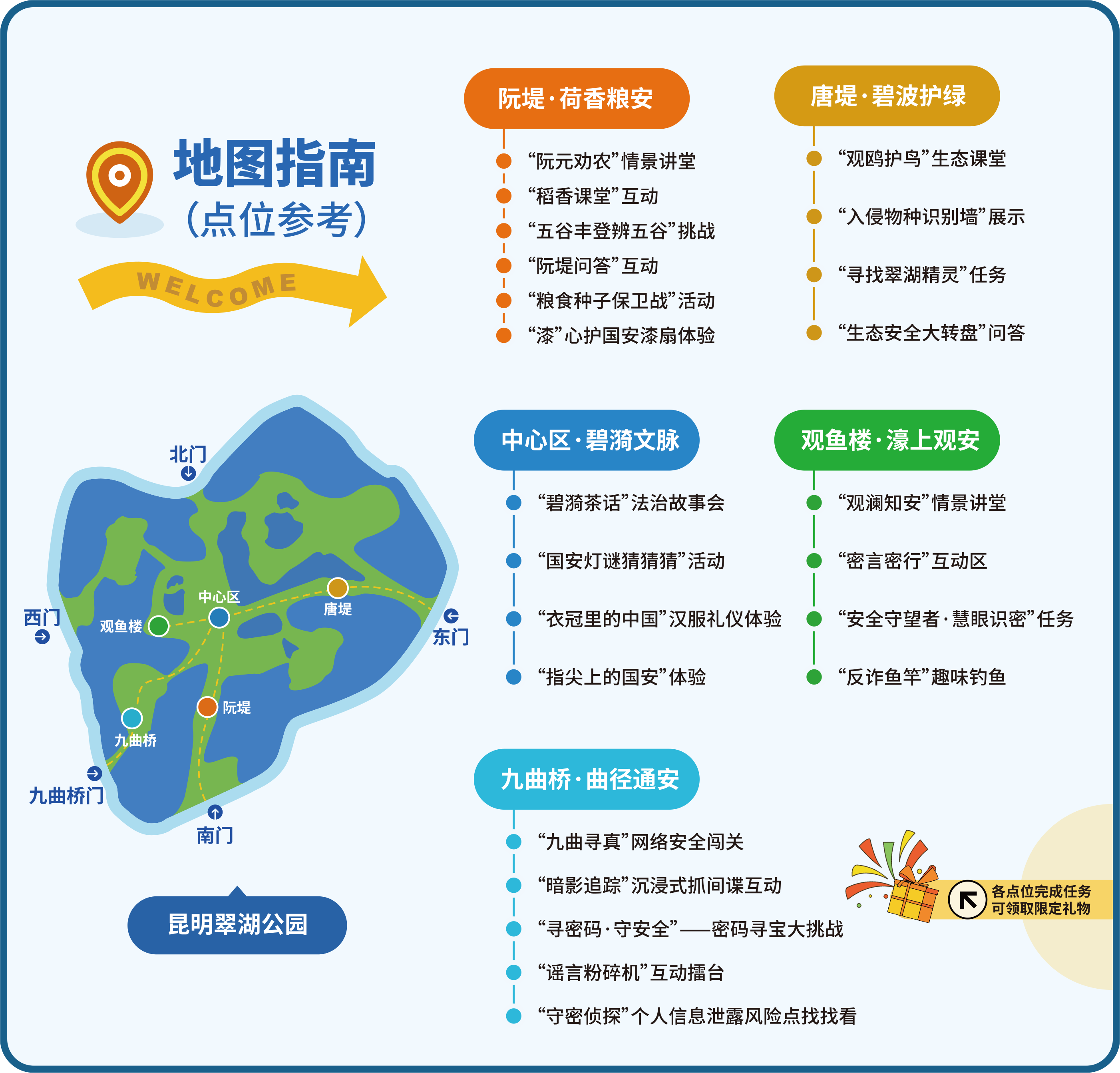 本次活动以“国安教育+城市漫步+历史探寻”为特色,将围绕粮食安全、生态安全、文化安全、社会安全、网络安全等重点领域,结合保密、防谍、密码安全教育等内容,在翠湖设置五大沉浸式打卡点位,通过情景演绎、互动闯关、非遗体验、实景科普等形式,打破传统宣传模式,让国家安全知识可学、可看、可玩、可体验。