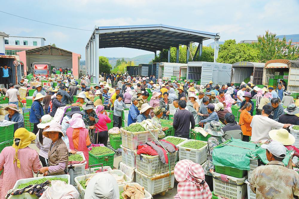 连日来,随着荷兰豆行情走俏,昆明市晋宁区六街镇大庄村荷兰豆交易市场迎来交易旺季。荷兰豆是晋宁区特色支柱产业,凭借高原气候优势,产品鲜嫩清甜,畅销全国及东南亚市场。目前,全区种植面积约3万亩,年产量约2万吨,六街镇为核心产区,已成为我国西部最大的荷兰豆交易集散地和晋宁乡村振兴的绿色名片。(云南日报 通讯员杨崇云 摄)