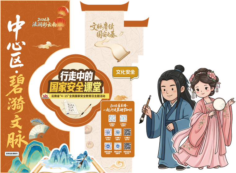 来听一场滇派清口娓娓道来的文化安全故事,汉服礼仪展演尽显国风之美,“国安”象棋对弈、“国安”灯谜高悬,每一道谜题都藏着守护文化根脉的答案。让文化安全在一针一线、一诗一谜、一言一行中,被看见、被传承、被守护。