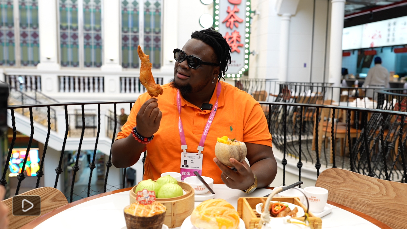 “我在海口吃老爸茶,老爸茶吼加(海南话,意为‘好吃’)!”尼日利亚籍主播博密(OLUWABUNMI HENRY JIMOH)在海口骑楼老街的椰城喜鹿老爸茶店里,手拿椰奶冻和炸鸡翅,用海南话向镜头热情表达对海南老爸茶的喜爱。