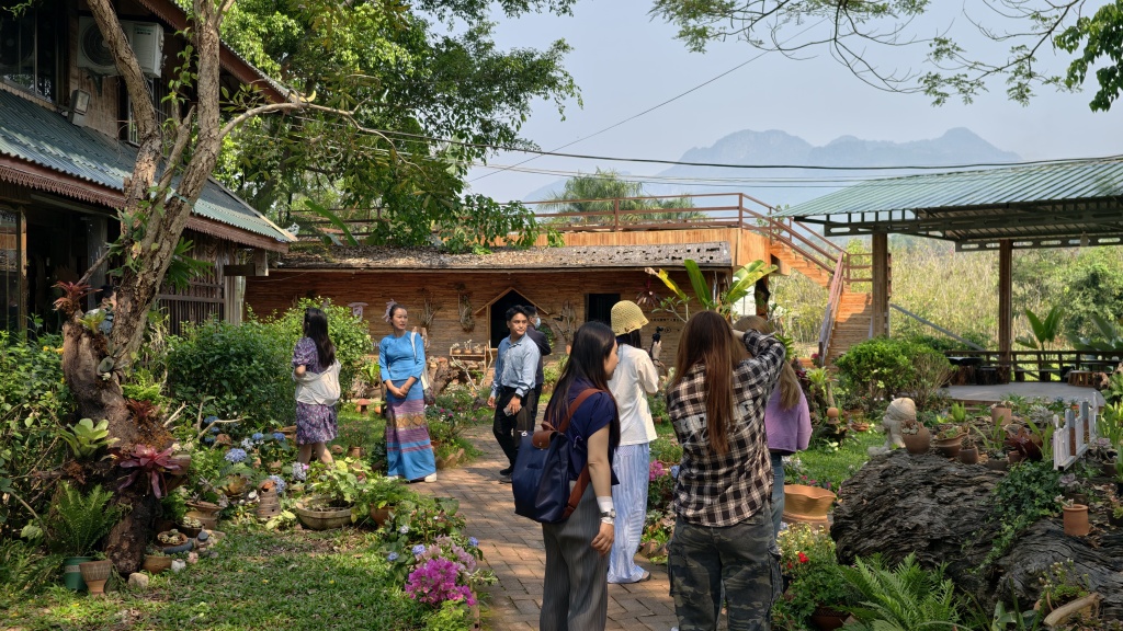 3月24日,游客在勐腊县勐仑镇创业者刀恒的咖啡馆院子里游玩。澎湃新闻记者郑问/图