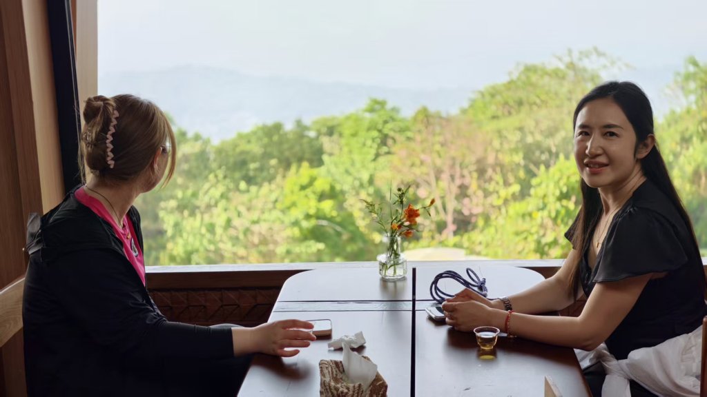 3月25日,两名游客在南糯山“野叙森林空间”喝咖啡休息。澎湃新闻记者郑问/图