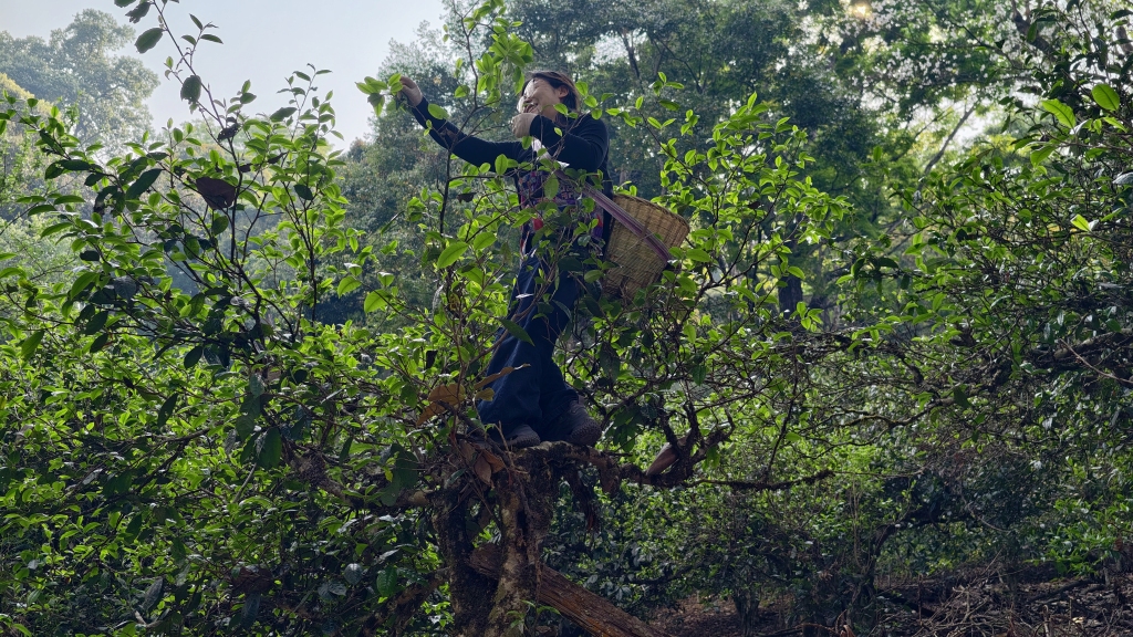 3月25日,一名茶农在南糯山茶树上采茶叶。澎湃新闻记者郑问/图