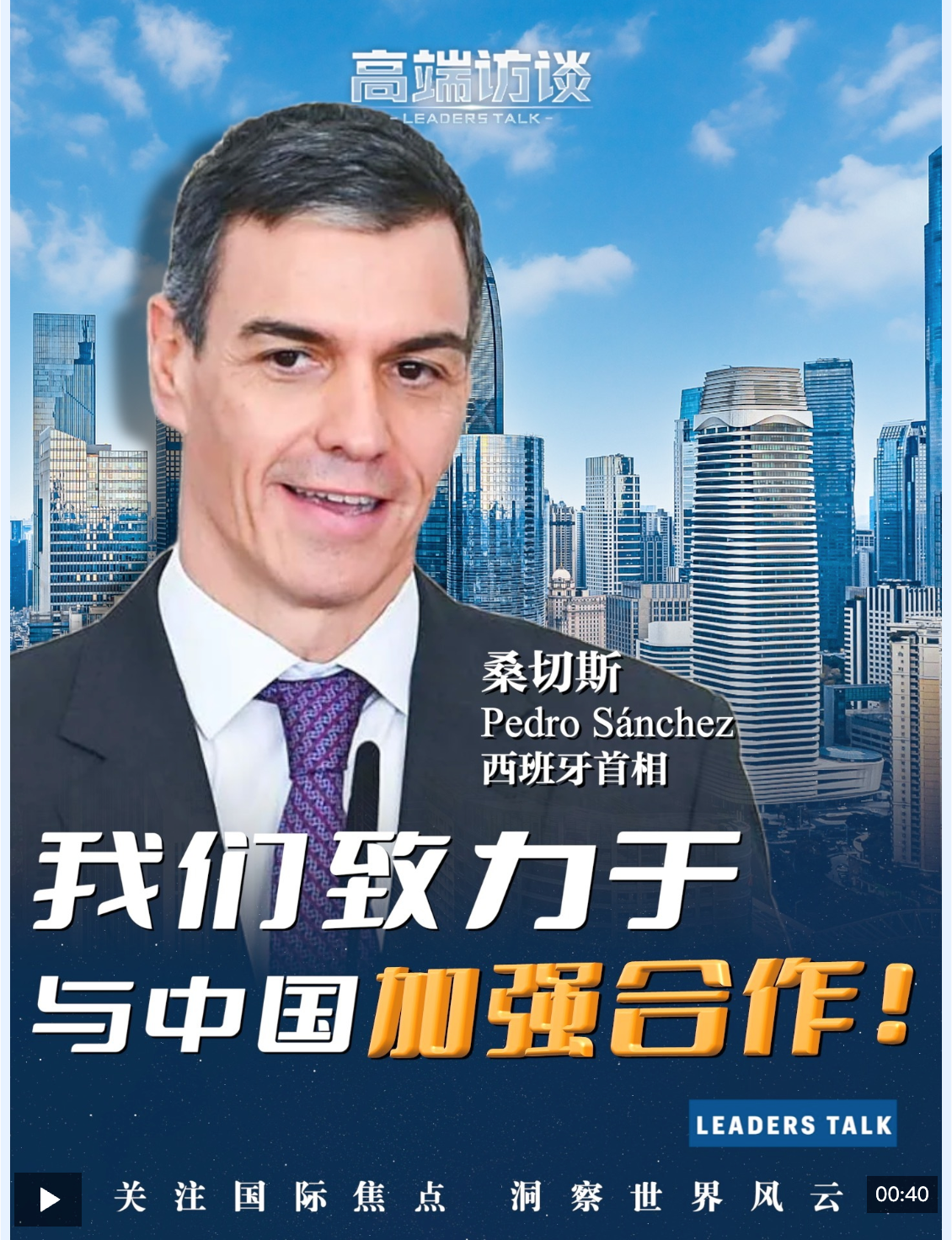 西班牙首相 桑切斯:我们是一个不仅有意愿、更愿意以实际行动和政策,为欧洲共同繁荣作出贡献的国家。我坚信,西班牙与欧洲致力于与中国加强合作、构建积极的合作议程,并在相互尊重与务实精神以及共享繁荣的基础上,与中国构建开放的关系。