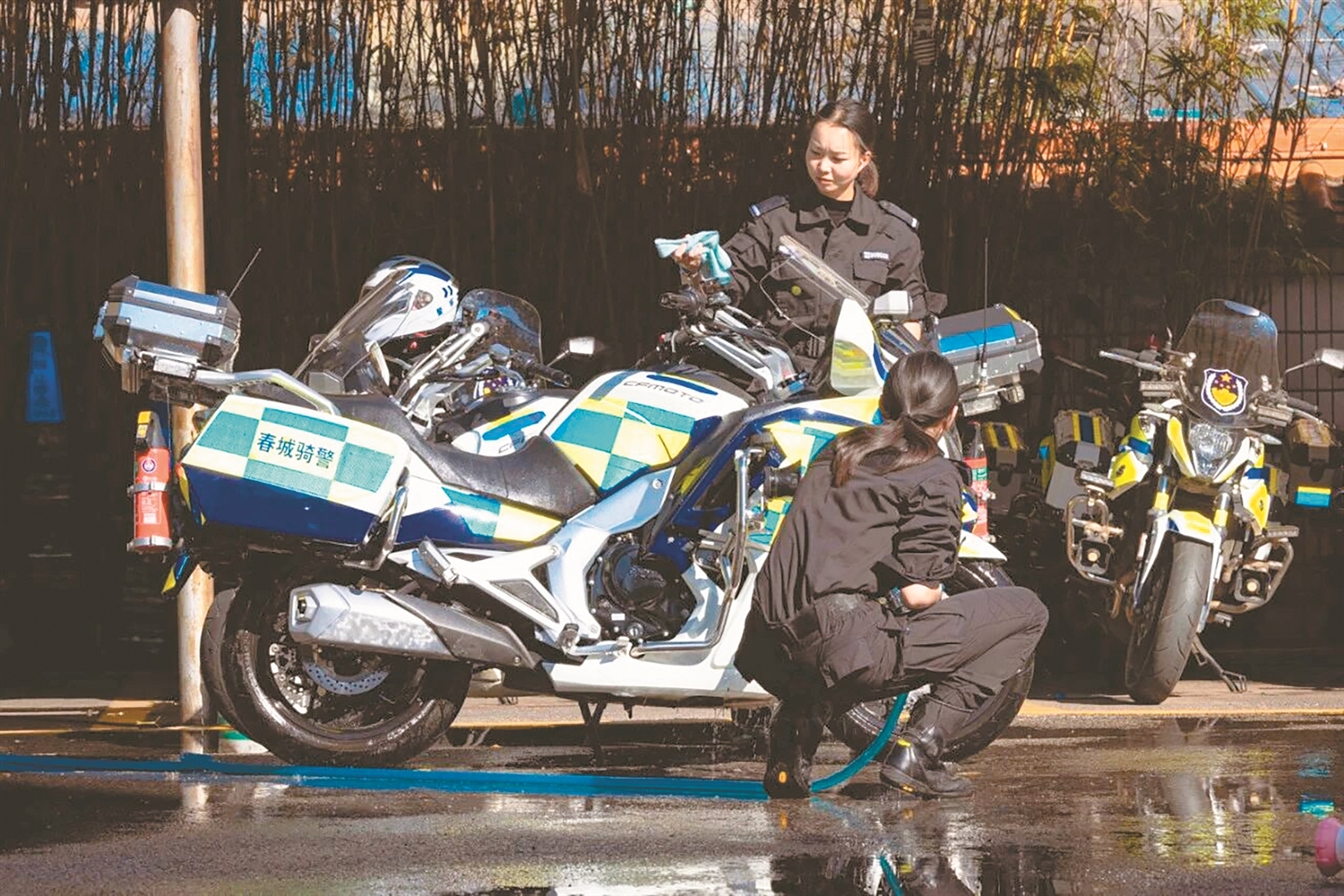 “第一次握车把时,虎口就被震得发麻。”初次接触重型摩托,她们的感受并不太好。但是在警队,训练标准是统一的,没有性别之分:摩托车驾驶、警务战术、应急处置……在狭窄的S弯,她们需对抗数百公斤的惯性,在距离和速度间寻找平衡。