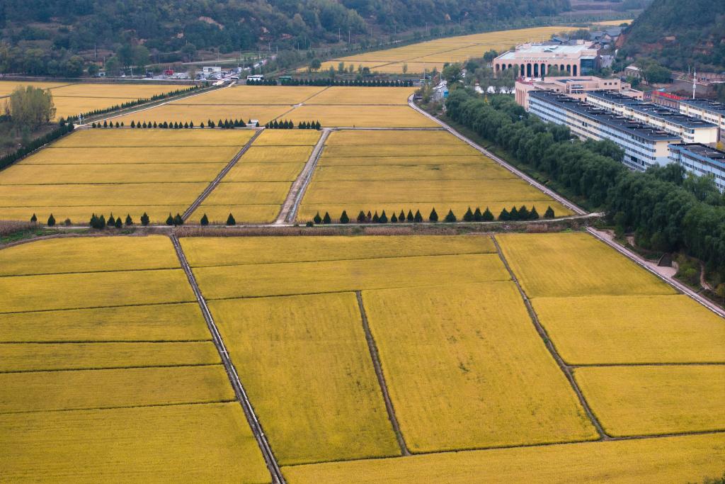 这是2025年10月16日拍摄的南泥湾稻田景色(无人机照片)。新华社记者 邵瑞 摄
