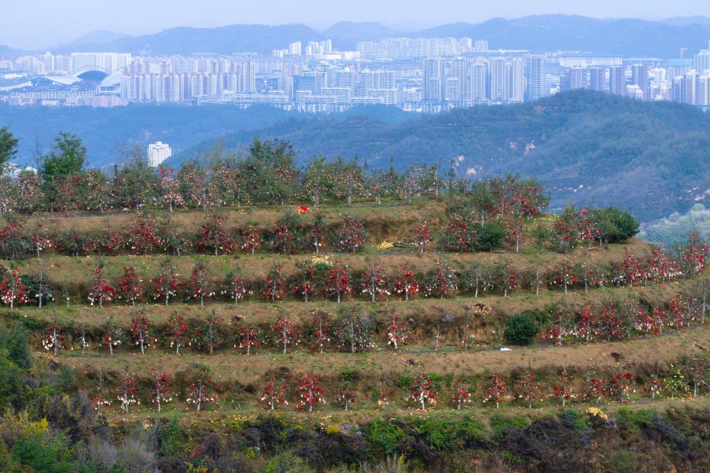 这是延安市宝塔区桥沟街道烟洞沟村苹果园景色(2025年10月17日摄,无人机照片)。新华社记者 邵瑞 摄