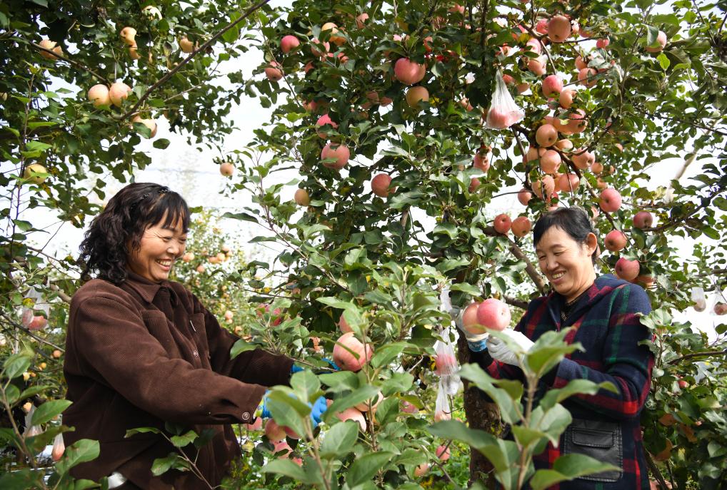 2025年10月17日,果农在延安市宝塔区桥沟街道烟洞沟村采收苹果。新华社记者 张博文 摄