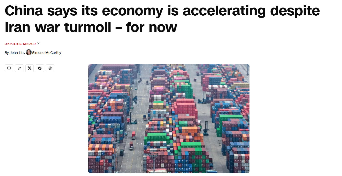 美国《华盛顿邮报》指出,中国今年一季度经济数据优于经济学家预期,增速也高于去年四季度。报道认为,虽然中东局势升级推高能源价格,加剧全球通胀压力并拖累世界经济增长,但经济学家普遍预计,中国经济目前仍有能力应对这一冲击。