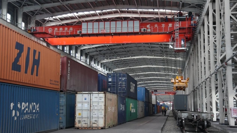 阿拉山口站室内集装箱换装库内,一列入境中欧班列正在换装。布仁巴特 摄