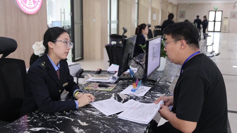 阿拉山口站货装车间货运员在国际联运楼内为客户办理进出口货物业务。布仁巴特 摄