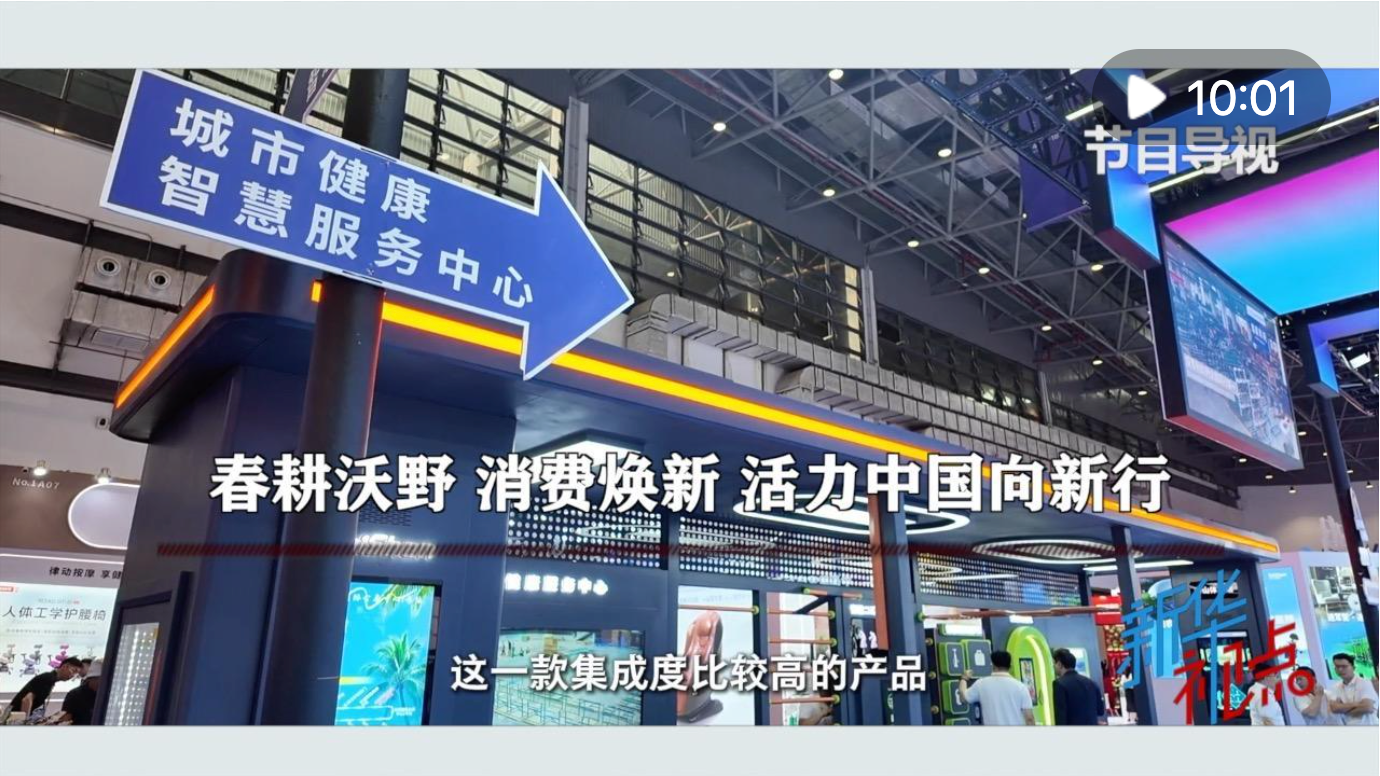 当你在等公交车时可能会无聊,这个时候你可以先健身,同时如果你手机没电了,还可以在这个区域进行手机充电。如果天下雨了,还可以借这里的共享雨伞。这是第六届消博会现场泰山体育展出的全球首发产品“城市健康智慧服务中心”,模拟的场景是未来的公交站台。