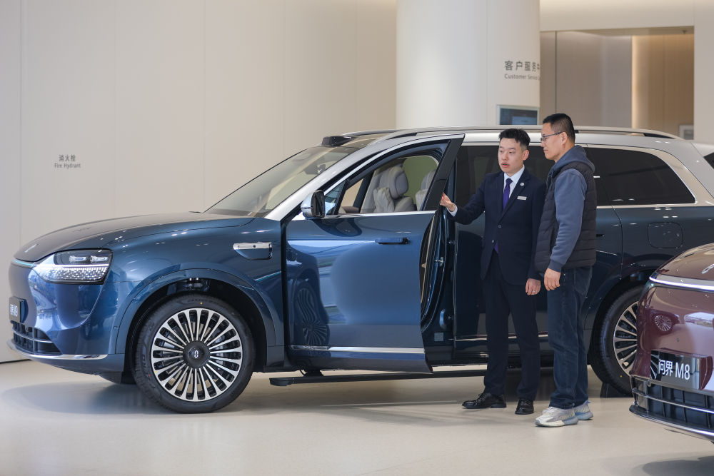 4月10日,在山东省青岛市李沧区,消费者在展厅选购新能源汽车。新华社发(张鹰 摄)