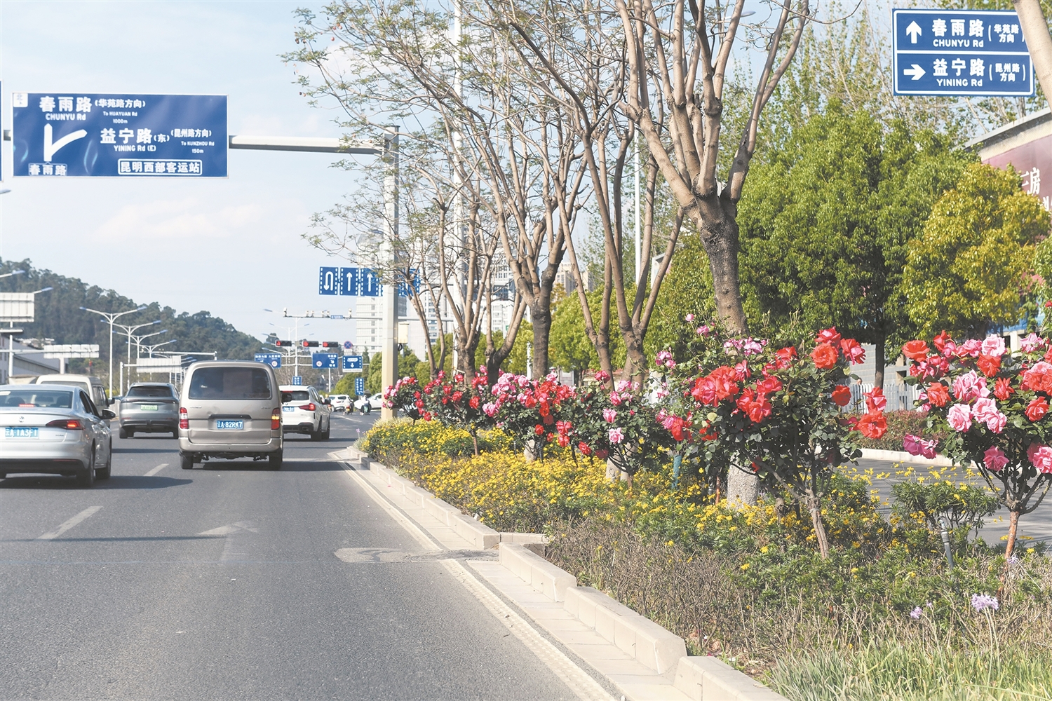 近日,西山区春雨路两旁的树状月季迎来盛花期,粉嫩硕大的花朵缀满枝头,道路更添浓郁春意。