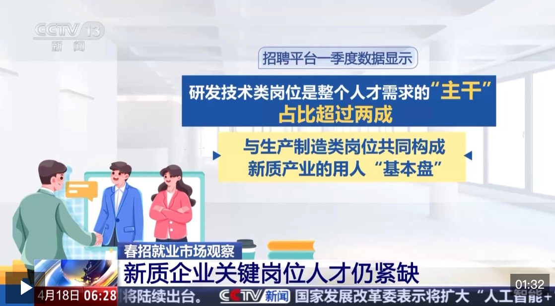 今年一季度新质产业招聘需求旺盛,研发岗位成为增长主力。在整体需求上升的同时,招聘数据显示,一批关键核心技术岗位仍然是“岗多人少”,人才紧缺。
