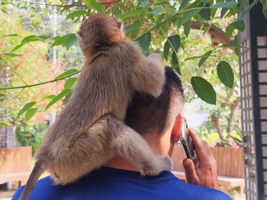 几天暖心照料下来,原本胆怯警惕的小猕猴慢慢放下了戒心。它不再缩在角落,而是开始主动往救援人员身上爬——一会儿黏在肩头,一会儿紧紧抓住衣角,走到哪跟到哪,摇身一变成了乡政府里人见人爱的“小团宠”。队员们笑着说:“这哪是救了一只猴,简直是多了个‘编外队员’。”