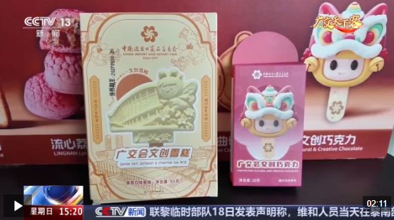 总台记者 朱解语:新品文创雪糕造型采用的是广交会展馆的元素,结合了好宝、好妮的萌趣形象,还点缀了广东特色的木棉花。逛展累了来一口,真是清甜又解暑。新品文创巧克力,它不仅和我们的吉祥物造型相融合,还创造性地运用了广东醒狮的元素。
