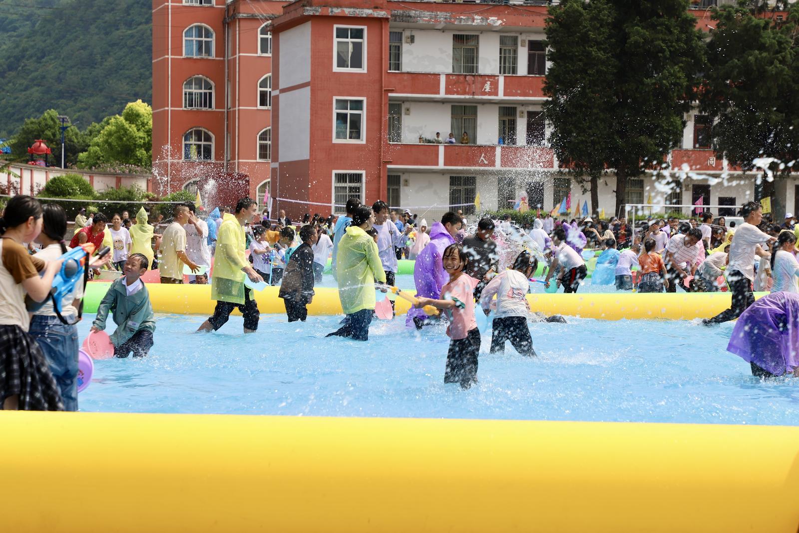 夜幕未临,非遗打铁花已惊艳全场,滚烫铁花凌空绽放,火树银花照亮水乡夜空,传统技艺的震撼与壮美直击人心。补掌小河之上,竹筏轻漂、碧水悠悠,游客乘筏漫游,在如画景致中卸下疲惫,尽享悠然时光。古敢中学内,万人泼水狂欢激情开闹,水花飞溅、笑语连连,大家互送吉祥祝福,现场化作一片欢乐海洋。