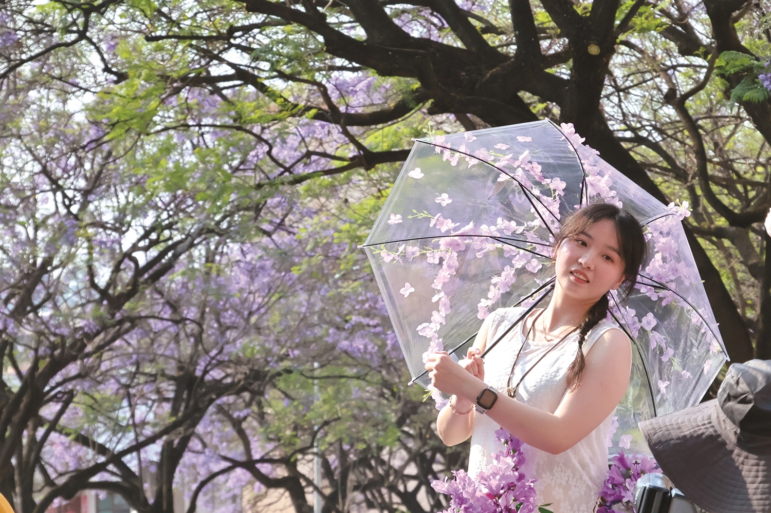 作为昆明最具代表性的蓝花楹观赏地,教场中路每年都会因这场“紫色盛宴”而热闹非凡。记者现场看到,原本沉寂的枝头被紫色花朵密密填满,微风拂过,花枝摇曳,紫雾漫过长街,一步一浪漫。摄影师们穿梭其间,不时指引游客调整姿势,“往左一点,举起手,很漂亮”的指引声此起彼伏,大家争相定格这份春日限定美好。