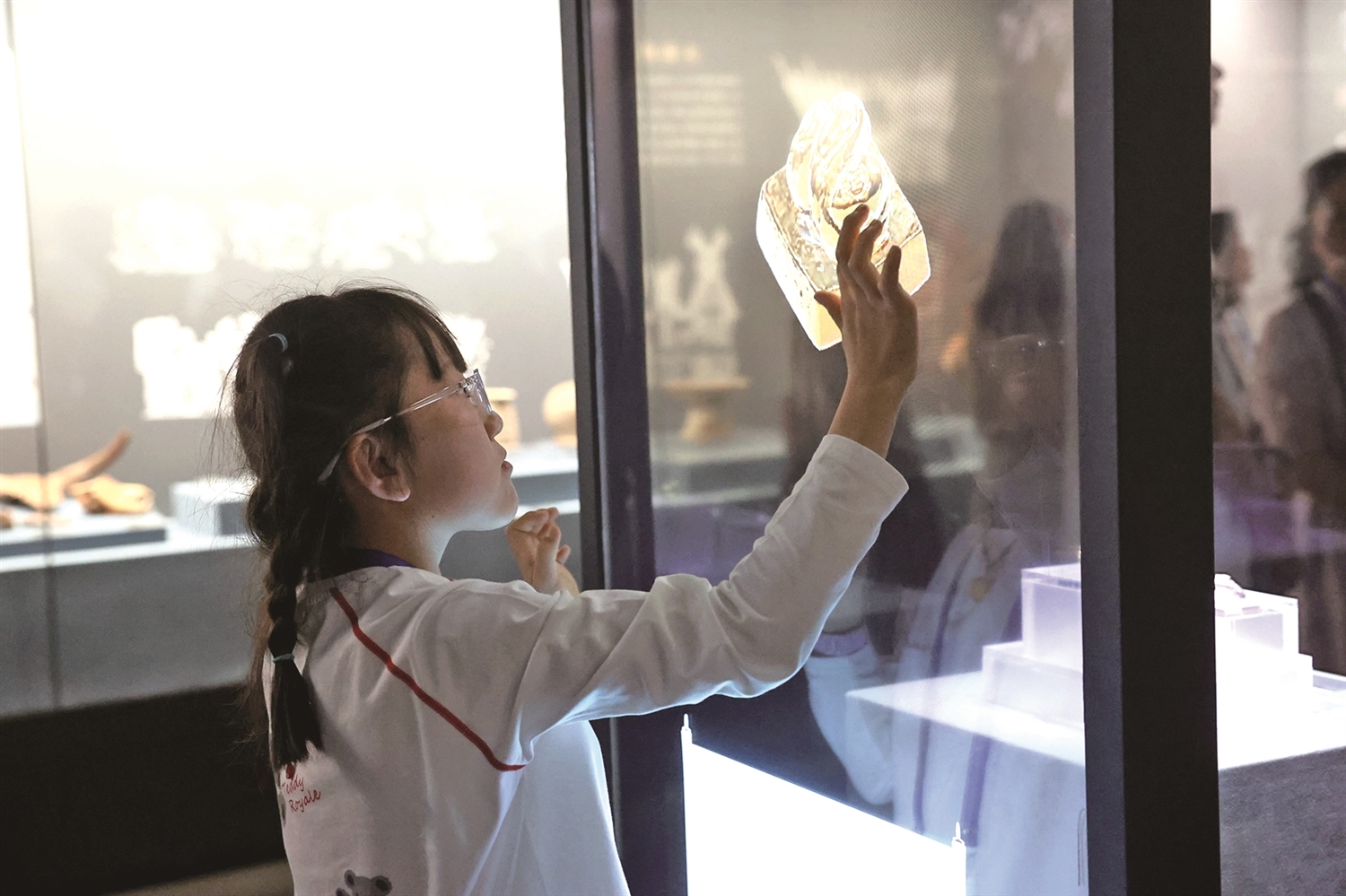 游客在石寨山国家考古遗址公园通过科技设备全面感受滇王金印细节
