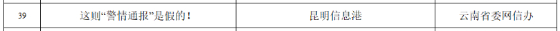 由云南省委网信办推荐,云南省昭通市公安局网安支队创作的《编造“吃野生菌一家7人被毒死”,网警依法查处》、昆明信息港创作的《这则“警情通报”是假的!》2部作品入围文字类复审作品名单;由云南省委网信办推荐,云南省互联网违法和不良信息举报中心创作的《云南省互联网联合辟谣平台》1部作品入围优秀辟谣平台(账号)类复审作品名单。