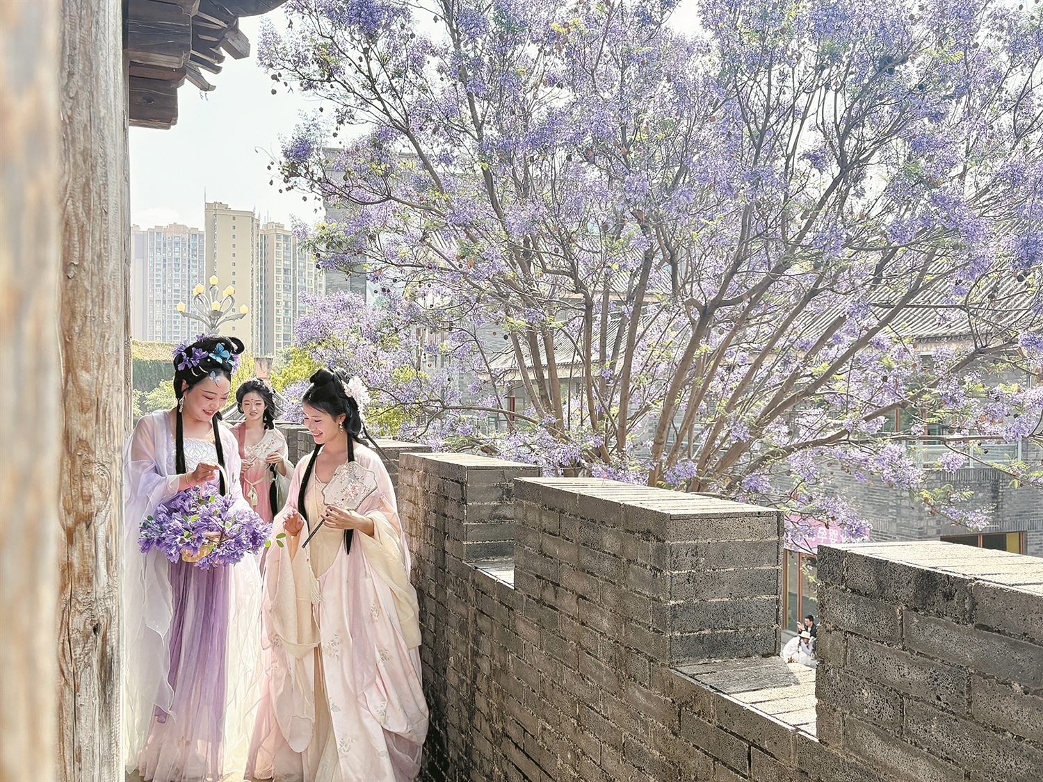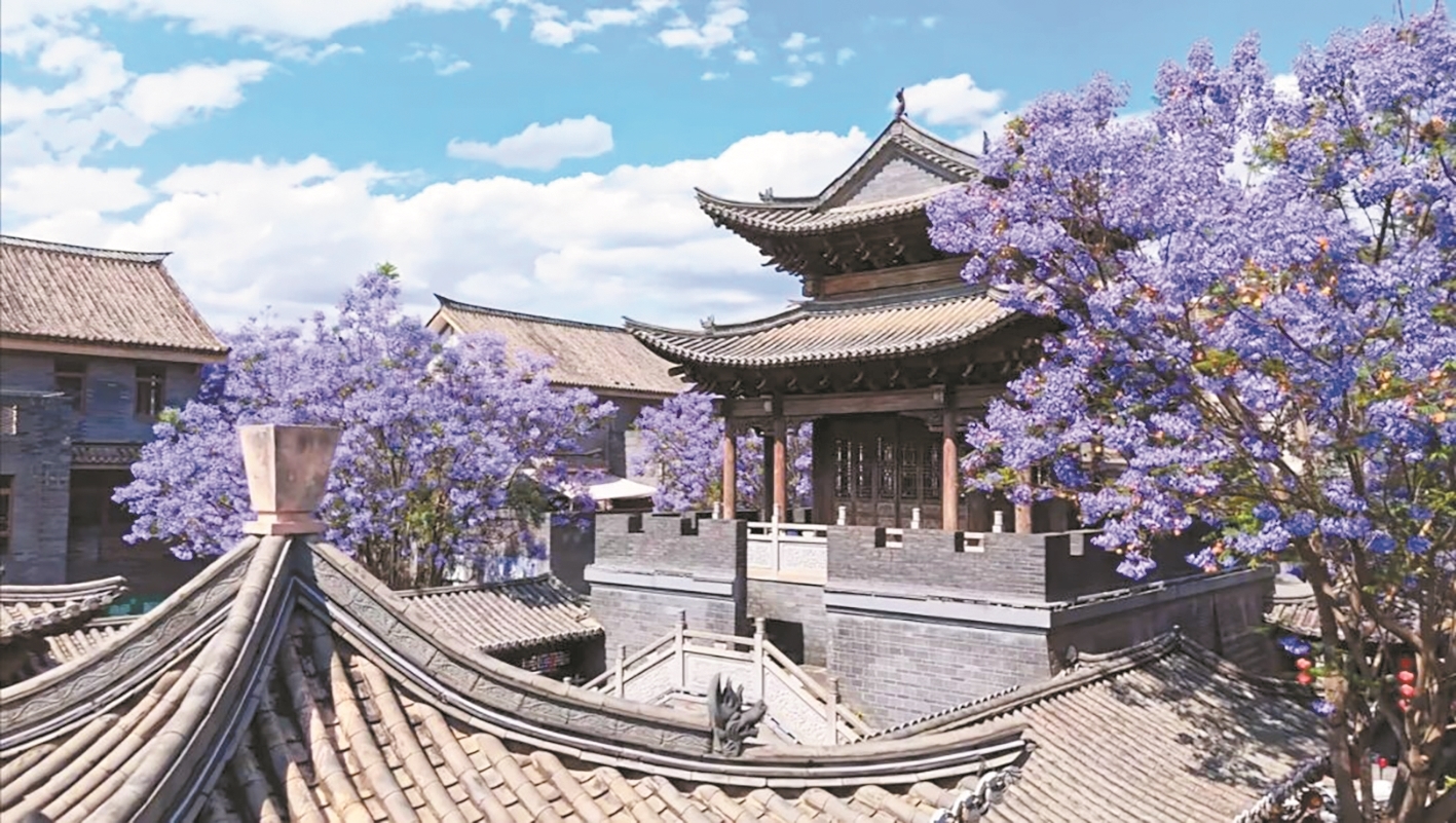 富民县上河院文旅小镇蓝花楹盛开。