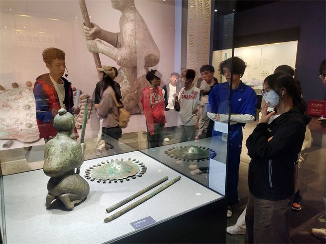 在战国双钺形铜戈、西汉执伞铜跪俑等文物前,同学们看得格外认真。讲解员提醒大家,这些青铜器的造型与纹饰是文化深度交融产生的“化学反应”,可不是简单的“符号拼盘”。她解释说,这些兵器既延续了中原青铜戈的形制,又融入了本地钺的礼器功能与独特的太阳纹、涡纹;执伞铜跪俑的仪仗制度仿自中原,而服饰细节则融合了滇人、百越、氐羌等多族群的特色。这种“形制承中原,符号创新意”的创造性转化,鲜活展现了边疆族群对中华文明既继承又创新的智慧,造型独特的青铜贮贝器也吸引了许多同学的目光。