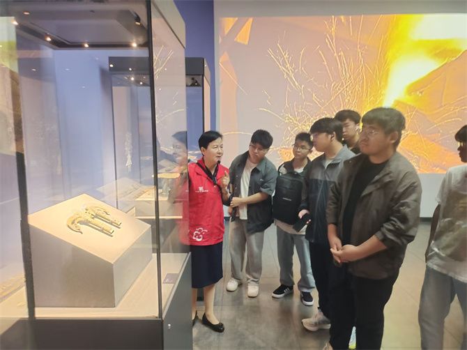 实践教学中,讲解员通过一件件文物引导大家思考,“古滇文化从来不是孤立发展的,大家看这些青铜器的造型和纹饰,其中蕴含的礼制观念和审美追求,其实和中原文化深深共鸣、彼此借鉴。它们所承载的宇宙观、天下观、社会观与道德观,早已为中华民族共同体的形成,埋下了深厚的文化根基。”在讲解员的带领下,同学们通过观察记录、拍照速写等现场任务,主动挑选自己感兴趣的文物,认真记下其中展现的民族交融痕迹与历史画面。一旁的老师也适时补充:“这些文物连起来,就是一条清晰的历史脉络:古滇国并非独自成长,而是通过持续的经济往来、文化交流与政治融合,最终深深汇入了中华文明多元一体的壮阔洪流。”