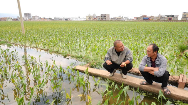 在慈姑种植基地,农科站工作人员为种植户讲解管护要点。高级农艺师保增平介绍,慈姑苗期需预防根腐病、软腐病,大田需控制水深,施肥坚持“少施多次”、以水溶肥为主,既能防烧根、减病害,又能促苗株健壮,还能减少农资浪费。