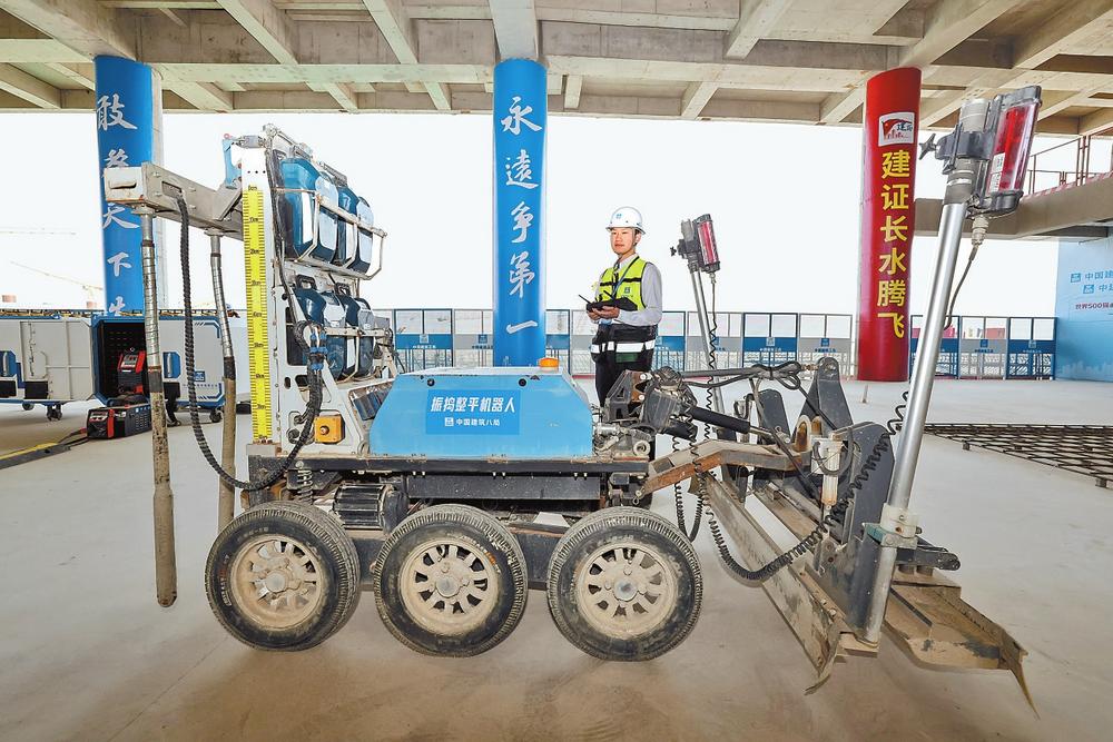观摩活动现场展示的振捣整平机器人。 记者 陈飞 摄