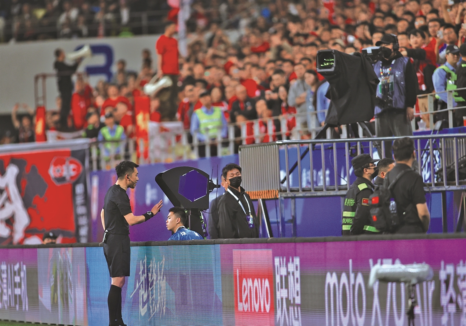 ▶第54分钟,奥斯卡门前抽射入网,主裁判戴弋戈场边回看VAR后,判罚云南玉昆球员卡约此前在中圈附近手球在先,进球无效