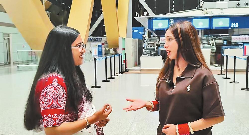 孙予爱(左)与其他印度乘客交流。