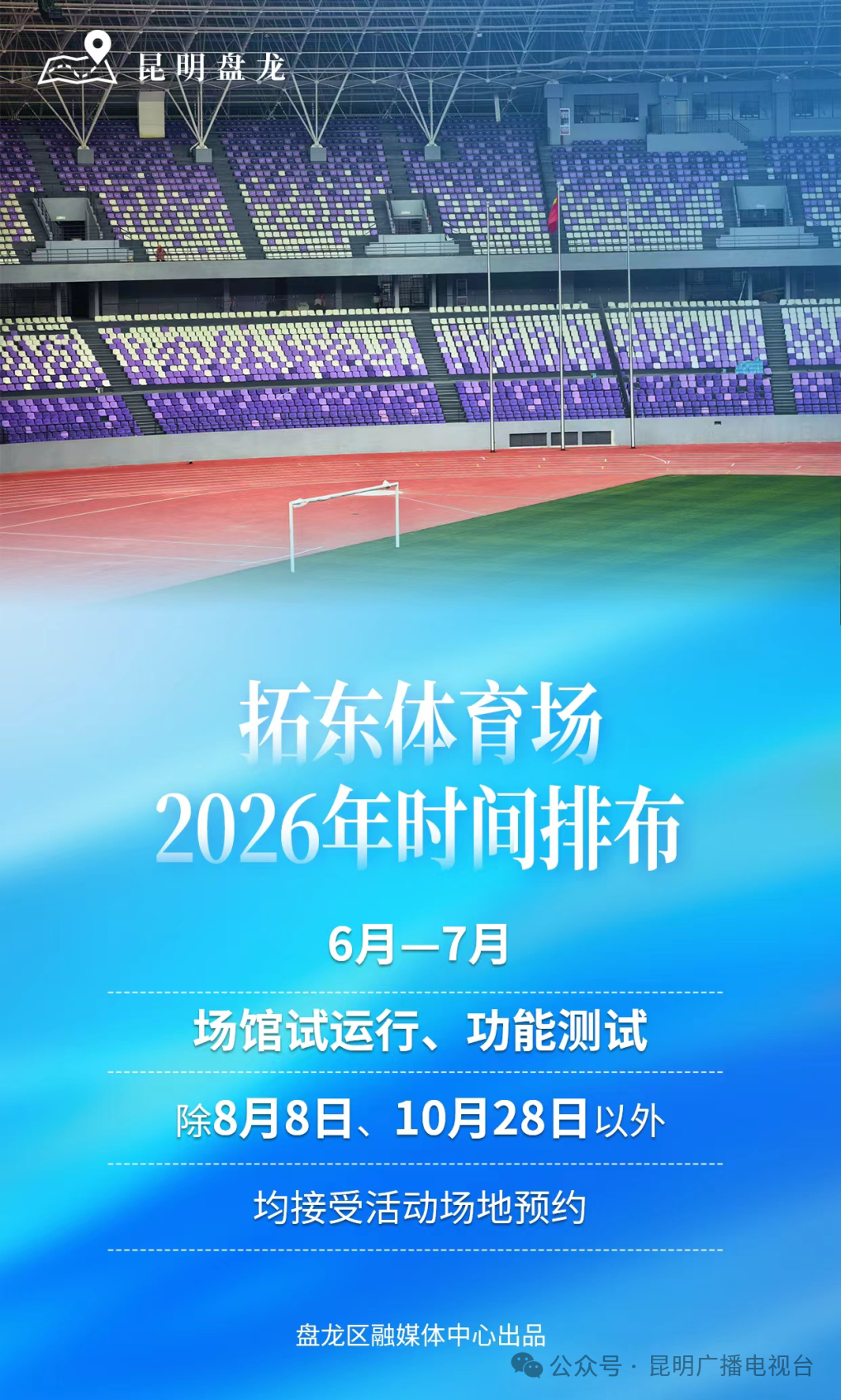 拓东体育场:6月—7月场馆试运行、功能测试;除8月8日、10月28日以外均接受活动场地预约。