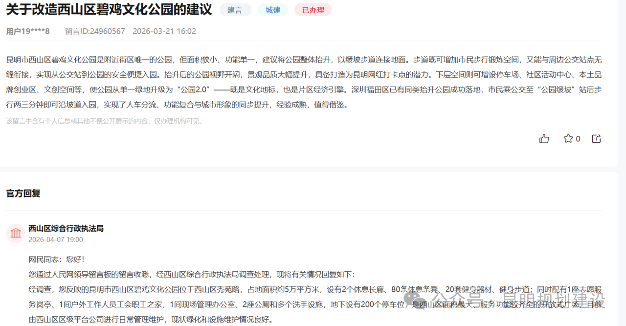 近日,针对市民在人民网地方留言板提出的“改造昆明市西山区碧鸡文化公园”建议,西山区综合行政执法局经调研后正式回应,将结合公园现状、片区规划及资金保障等实际情况,通过精细化管理和功能优化提升品质,同时透露未来公园改造将向功能复合化、交通便捷化方向升级。