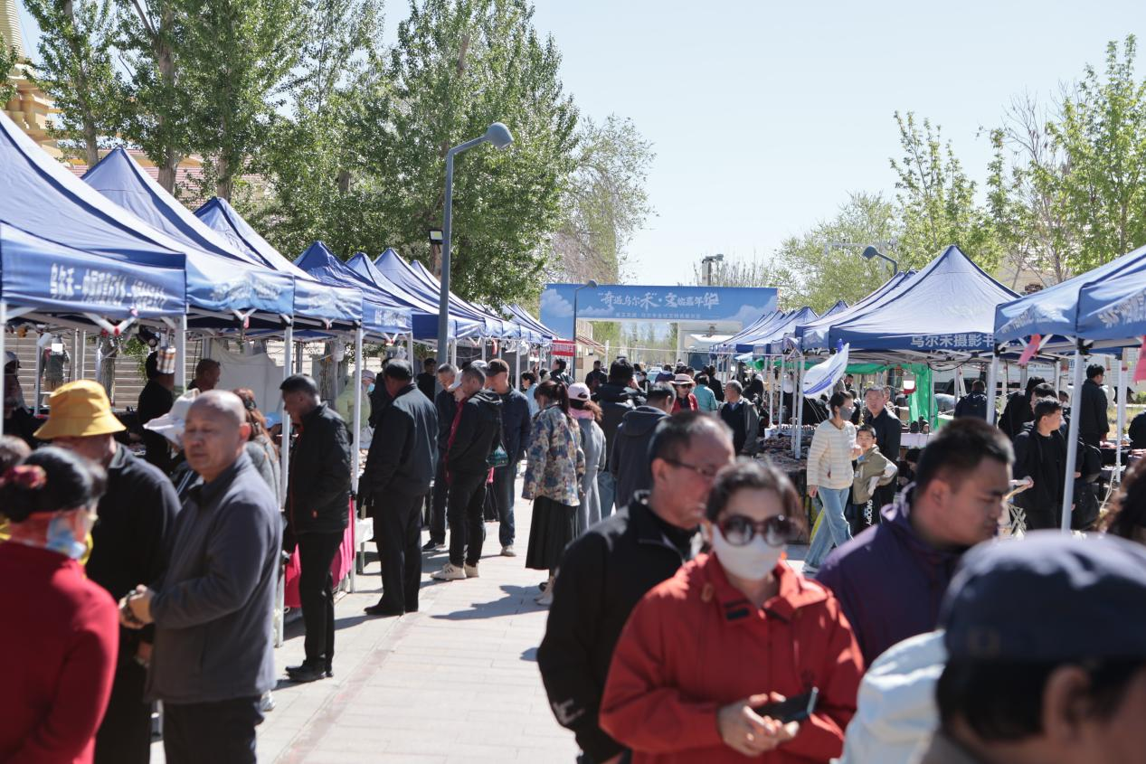 4月18日,在“荒野极境 奇遇乌尔禾”2026新疆特种旅游节荒野市集的乌尔禾金丝玉特色展示区人来人往。苗传葳摄