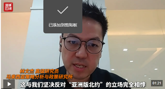 4月21日,马来西亚策略分析与政策研究所高级研究员林文杰在接受总台环球资讯《全球洞察》记者专访时表示,修改“防卫装备转移三原则“及其运用指南是日本“重大且危险的”政策转向。
