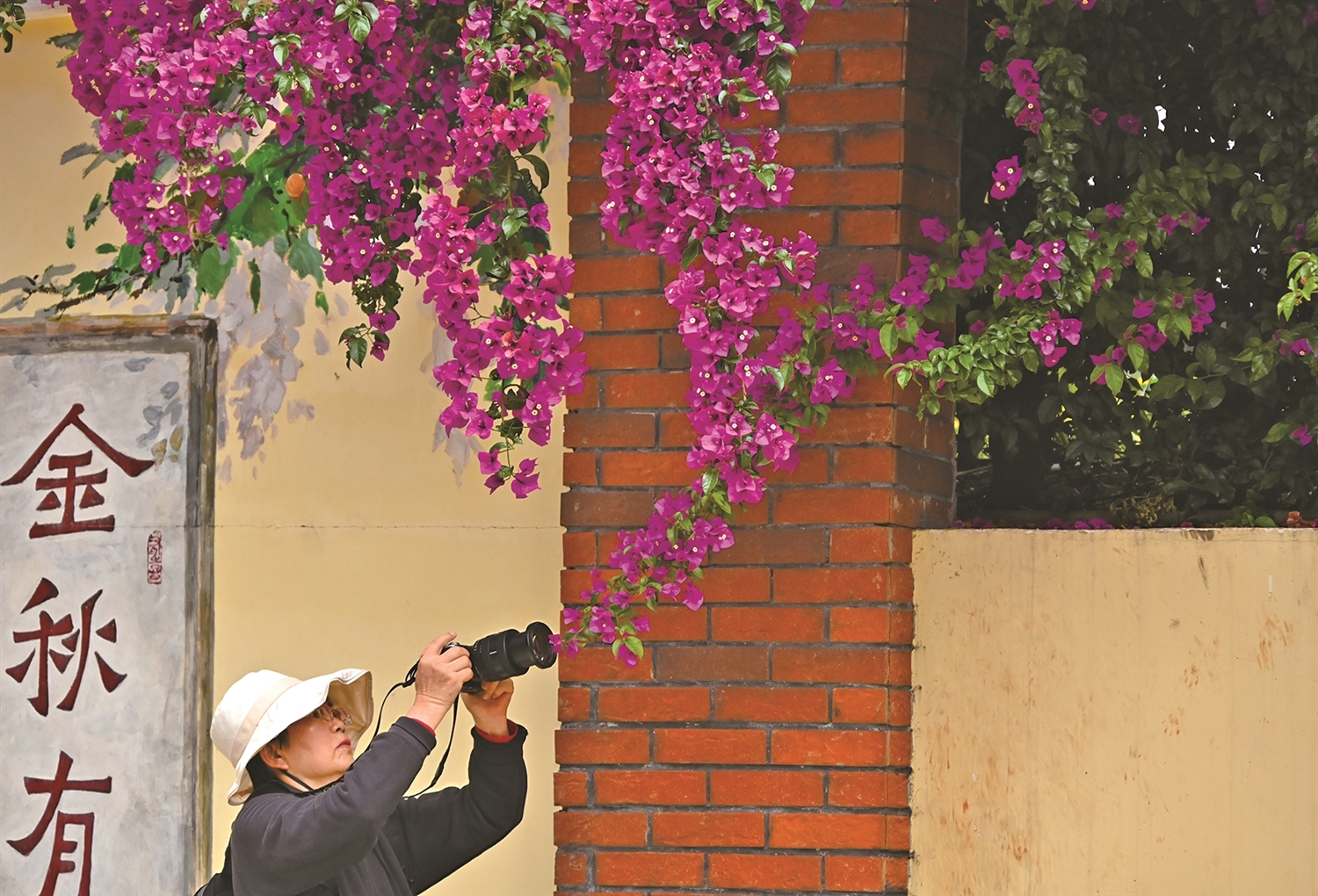 这个时间点,正值放学时段。走在放学路上的孩子和妈妈,总会不经意放慢脚步,在花海中走走停停。来打卡的人们来回穿梭,寻找属于自己的美丽瞬间。家住版筑翠园的李女士正用手机记录妈妈和姐姐以三角梅为背景的合影,不少附近居民随手一拍也“很出片”。“无论是路过,还是约朋友专门来拍照,都很治愈。”一名游客说。