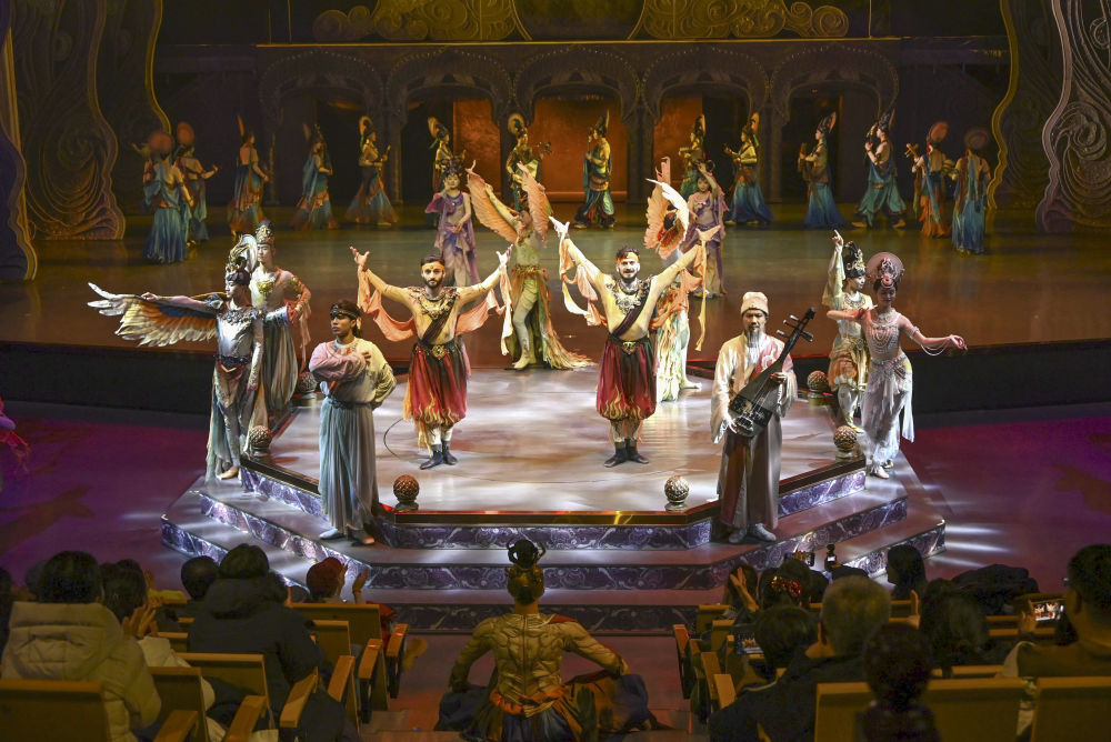 游客在甘肃敦煌观看大型洞窟沉浸式体验剧《乐动敦煌》。新华社发(张晓亮摄)