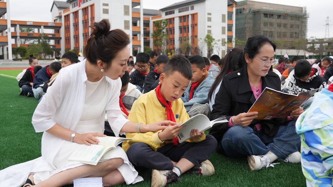 开幕式后,校园迅速切换至“静默模式”。在“静默阅读”环节,学生们手持心爱的书籍,在足球场、台阶等处席地而坐,沉浸于文字世界;老师们也融入学生群体,与孩子们一同低头阅读,还不时与身旁学生轻声交流书中感悟。整个校园浸润在浓厚的阅读氛围之中。三十分钟的沉浸式阅读,让师生们暂时放下琐事与杂念,集体静心阅读,寻得了一段沉心与好书对话的宁静时光。