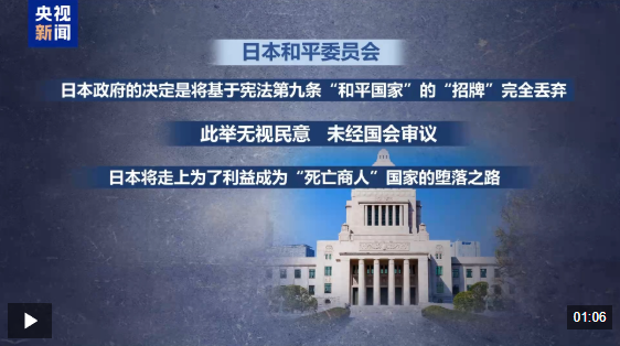 22日,日本和平委员会发表声明称,日本政府的决定是将基于宪法第九条“和平国家”的“招牌”完全丢弃。此举无视民意,未经国会审议。日本将走上为了利益成为“死亡商人”国家的堕落之路。