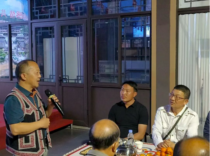 当晚,屏边绣莉丰乡民族工艺厂总经理侯瑜精心组织了一场非遗传承人座谈交流会,邀请屏边县文化馆馆长马立群及当地各门类非遗传承人与三转弯村考察组共叙文化传承与产业发展路径。会上,屏边县的苗族刺绣、蜡染、银饰锻造、芦笙制作、苗族古歌等非遗项目的传承人依次展示技艺、分享心得。三转弯村的代表们也带来了本村的民俗文化故事,双方围绕非遗活态传承、文创产品开发、文旅融合路径等议题展开了热烈而深入的讨论。